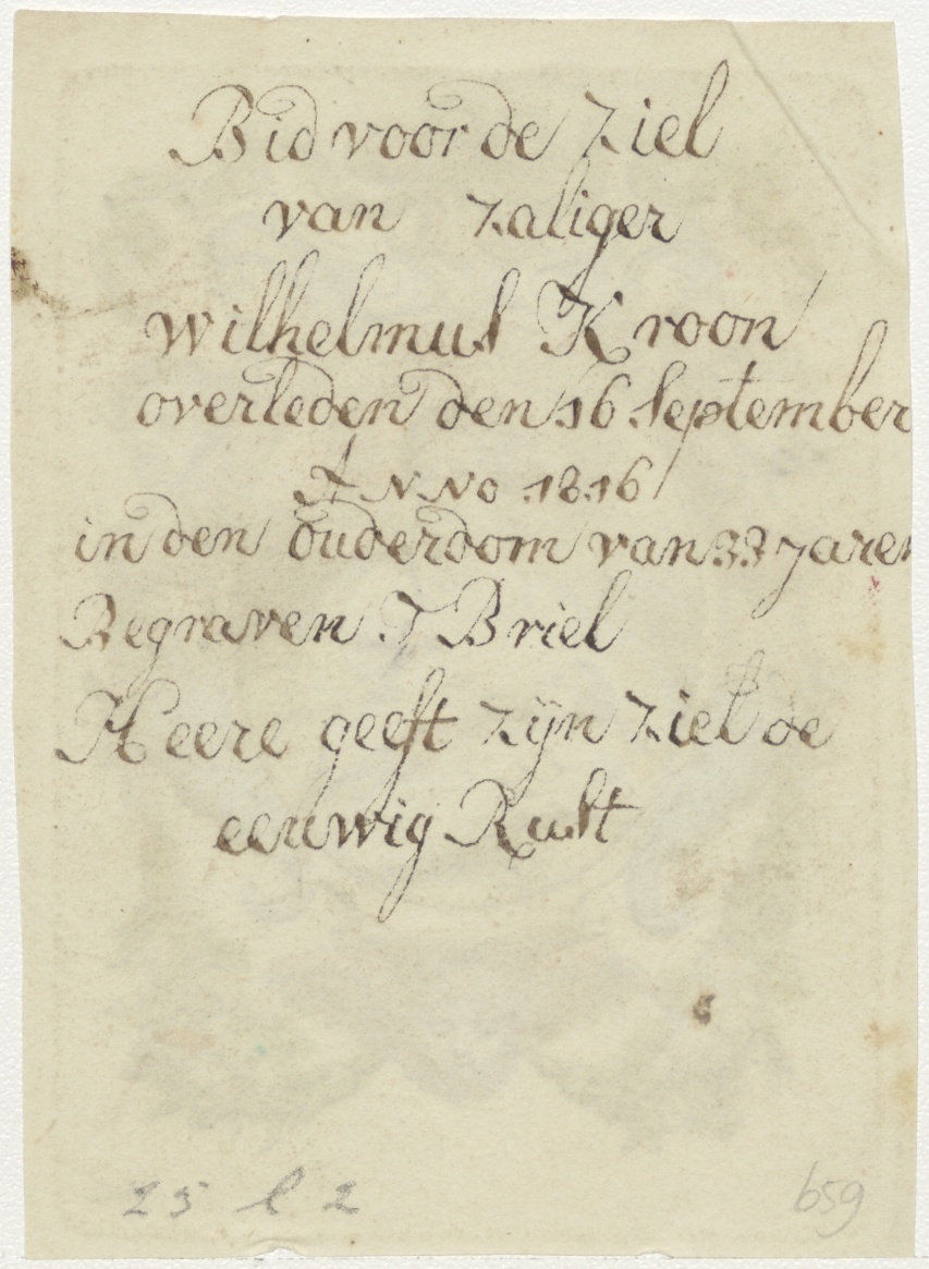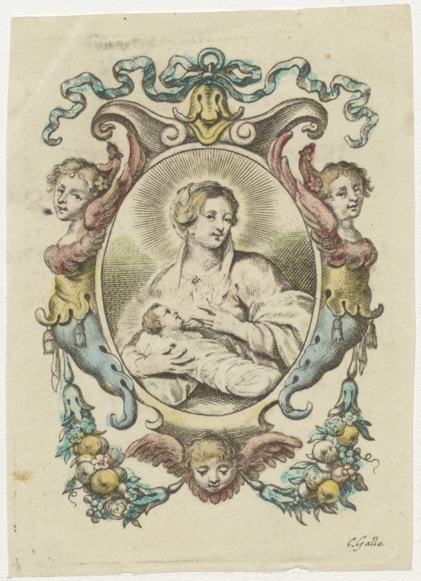 Maria met kind, ingekleurd, kz. Bid voor ziel Kroon (+1816) Briel