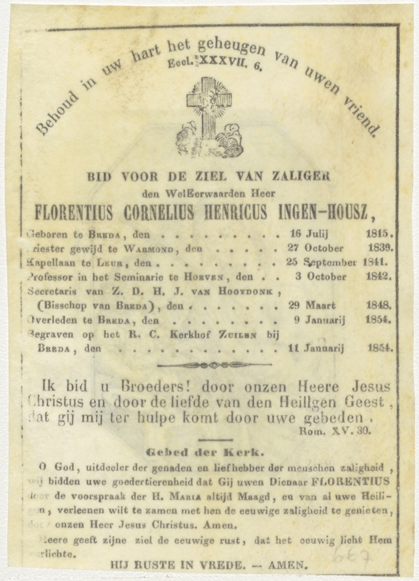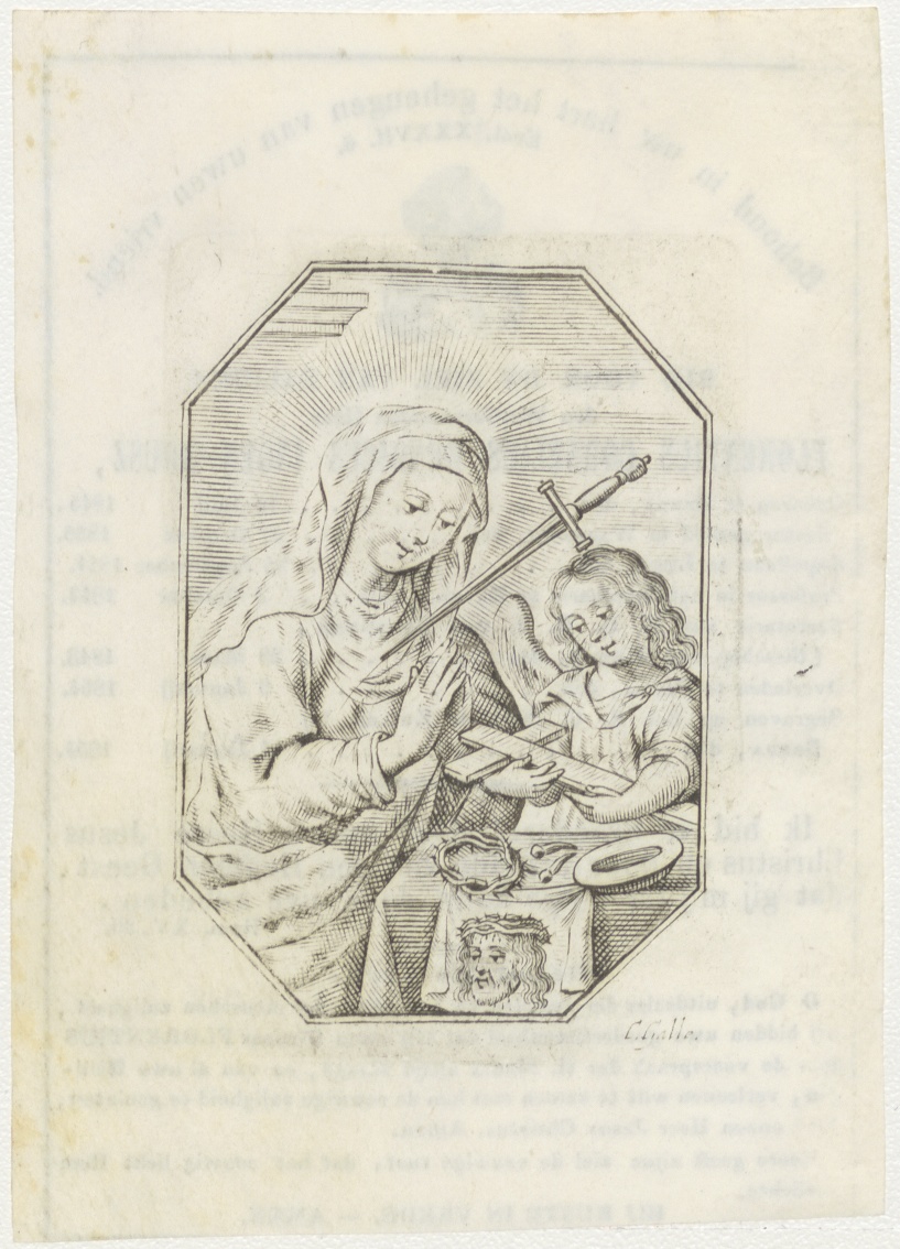 Maria met Christuskind en martelwerktuigen, kz. Religieus;Bid voor ziel Florentius Jagen-Housz (+1854) professor seminarie Warmond
