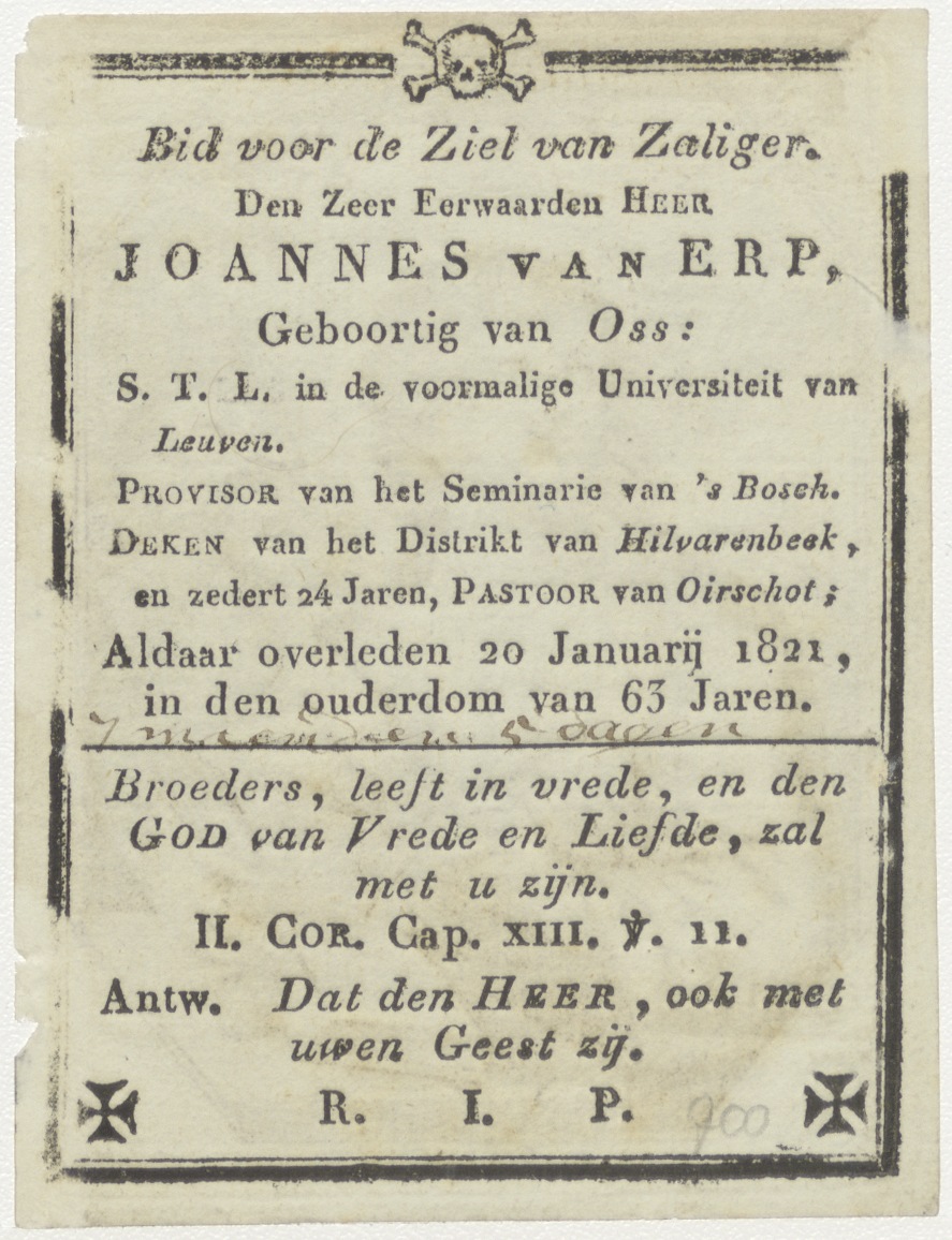H. Johannes (Joannes), met adelaar, kz. Religieus;Bid voor ziel Joannes van Erp (+1821);professor seminarie Den Bosch;