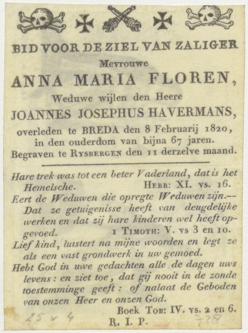 H. Franciscus en H. Clara, kz. Bid voor ziel Havermans-Floren (+1820);Breda;