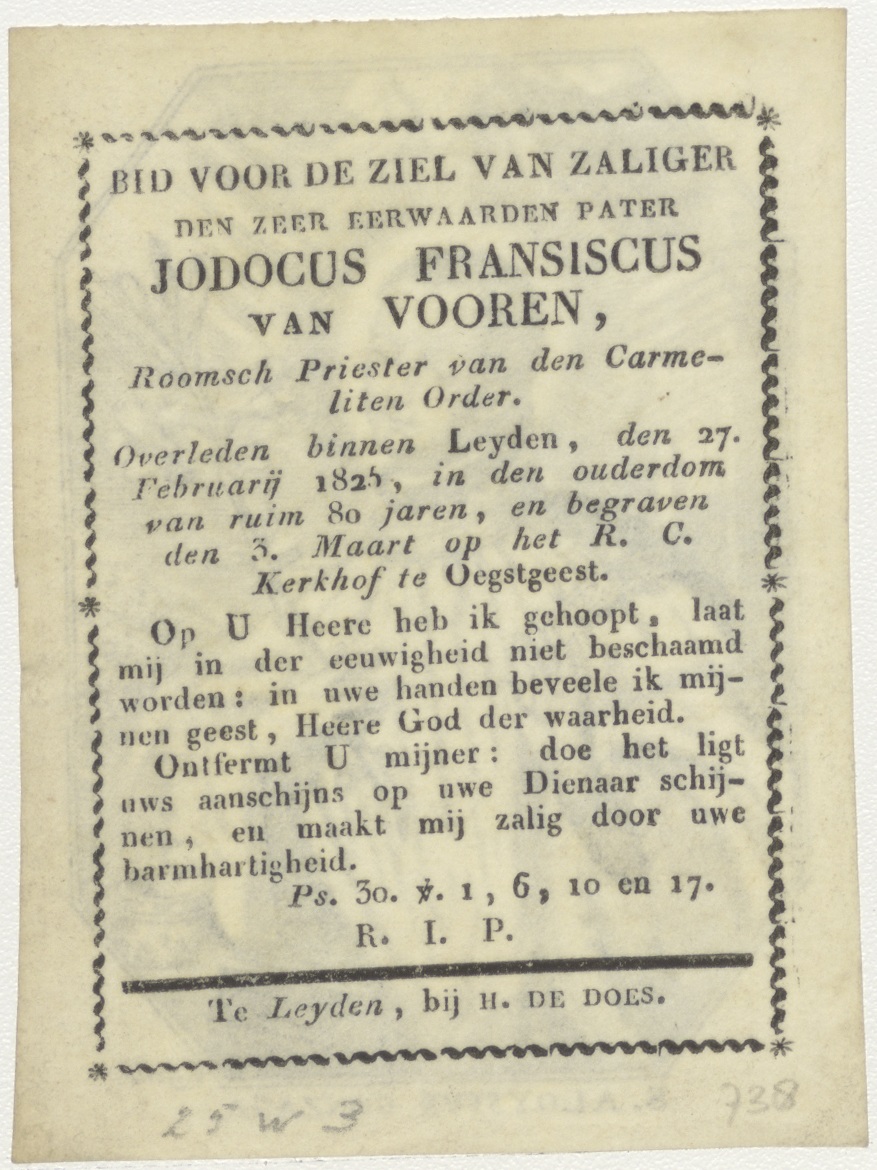 H. Aloysius van Gonzaga, kz. Religieus;Bid voor ziel Jodocus van Vooren (+1825);Leiden;pastoor Carmeliten orde