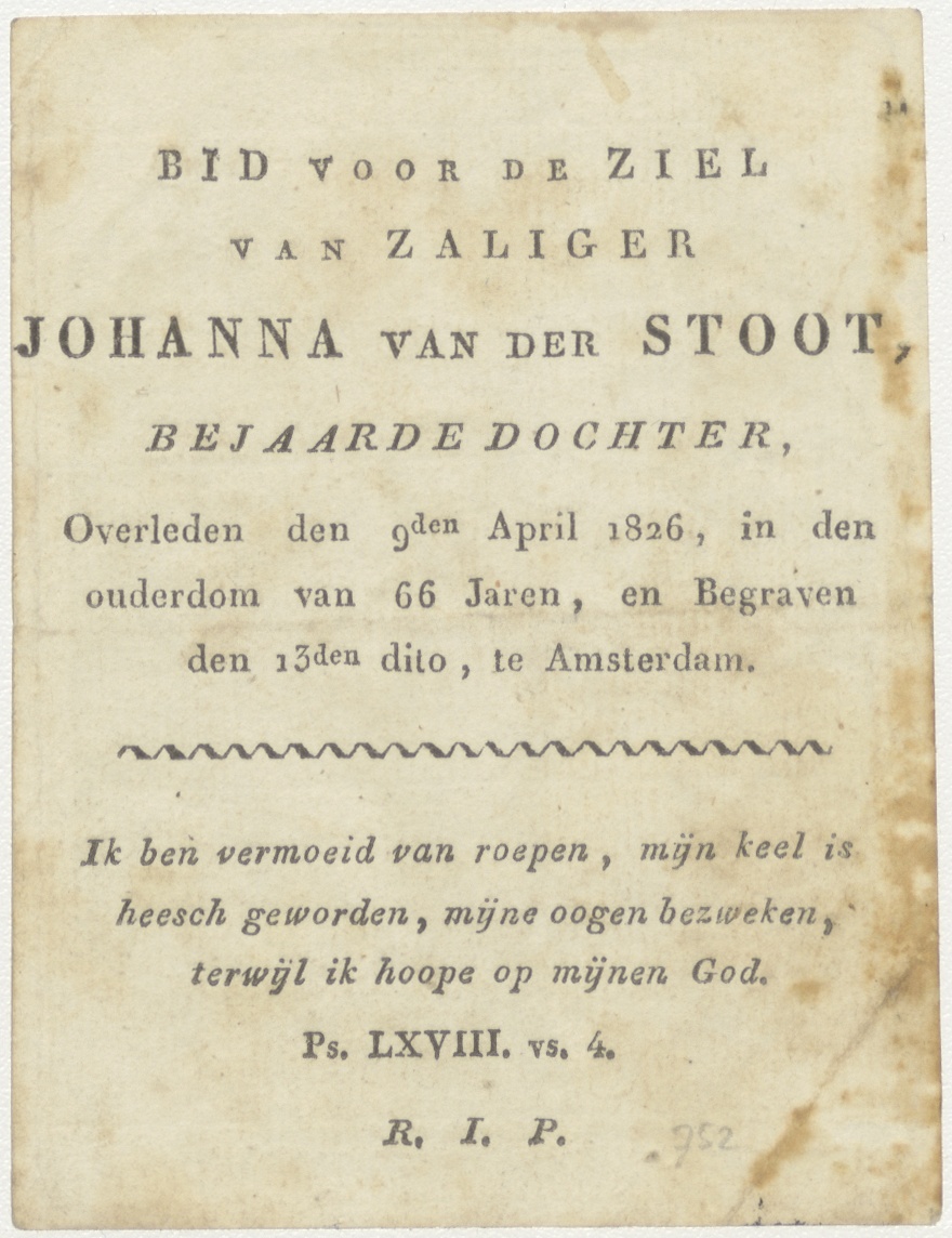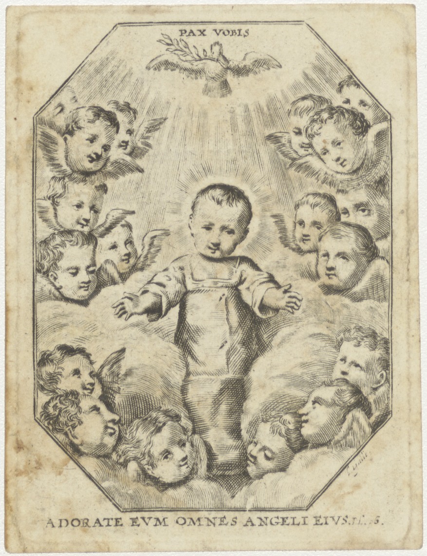 Christuskind omringd door engelenhoofden, kz. Religieus;Bid voor ziel Johanna van der Stool, bejaarde dochter (+1826);Amsterdam;