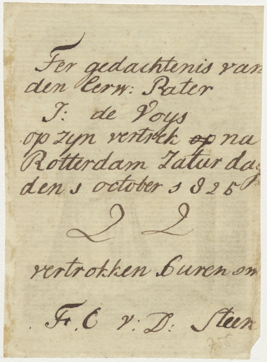 H. Franciscus Sales, kz. Ter gedachtenis aan pastor J. De Voys op zijn vertrek naar Rotterdam ... 1825 ... F.C. v.d. Steen
