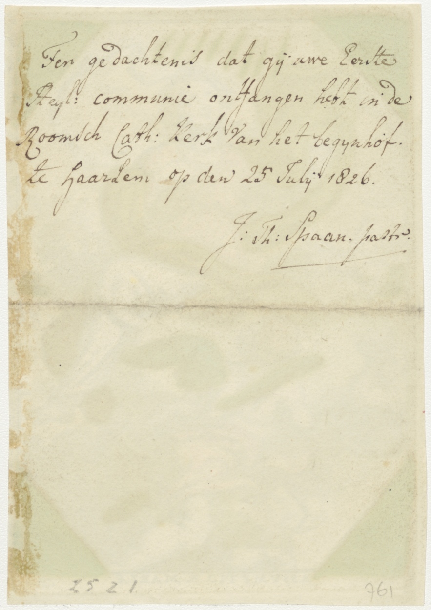Assumptio B. Mariae, hemelvaart van Maria, ingekleurd, kz. H. Communie;1826;door pastoor Spaan;Begijnhof;Haarlem;