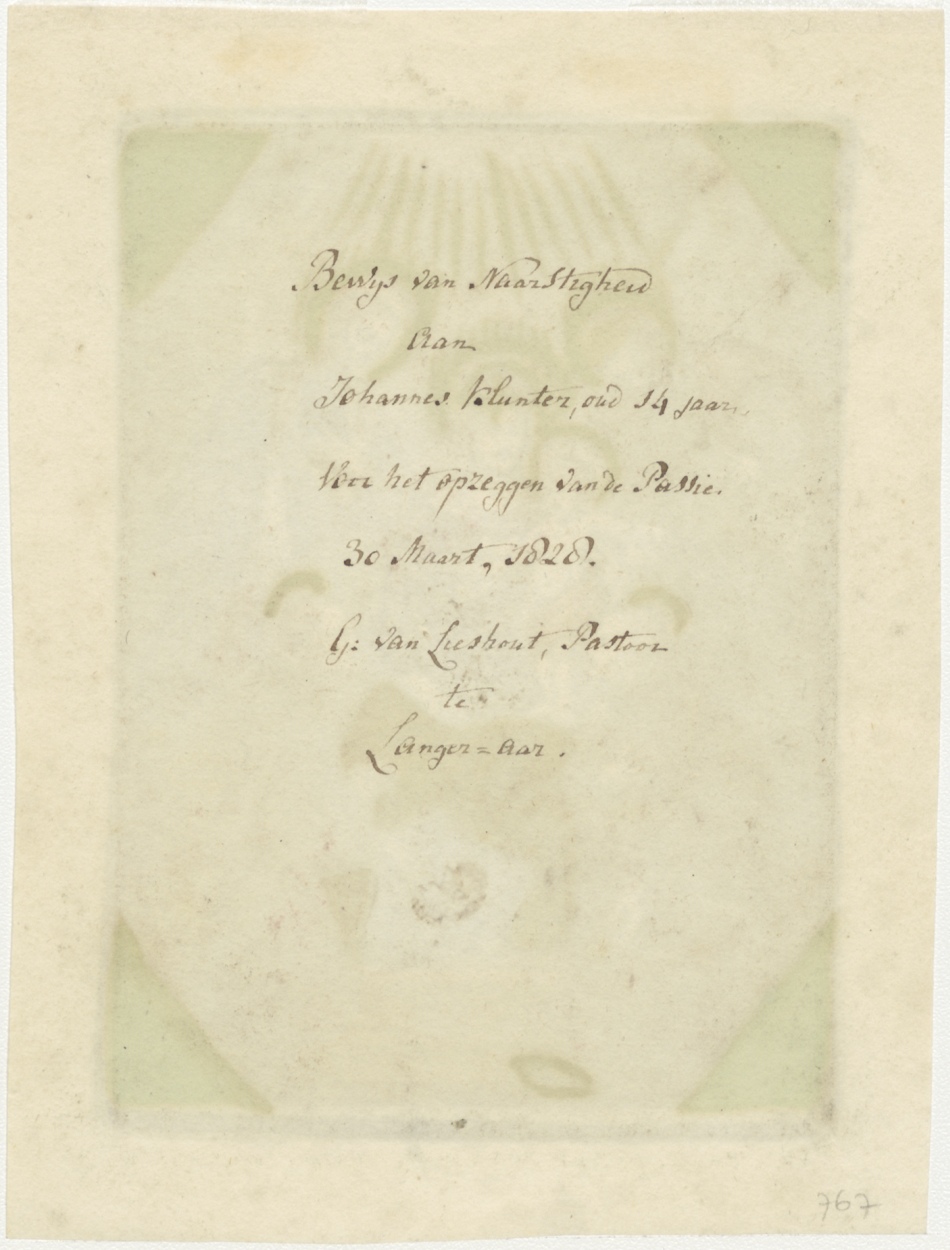 Maria met Christuskind, omringd door religieuzen, ingekleurd, kz. Beloning Kunter;1828;pastoor van Lieshout;