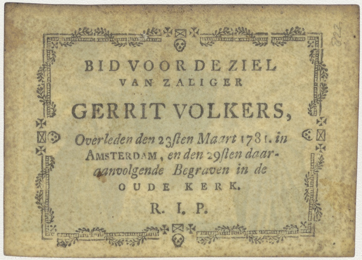 Maria Rosarii, rozenkrans, kz. Bid voor ziel Volkers (+1781);Amsterdam;