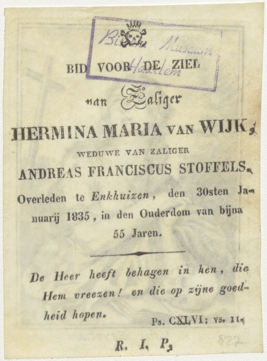 H. Maria Egyptica, kz. Bid voor ziel Hermina Maria van Wijk (+1835) Enkhuizen, weduwe van Andreas Franciscus Stoffels