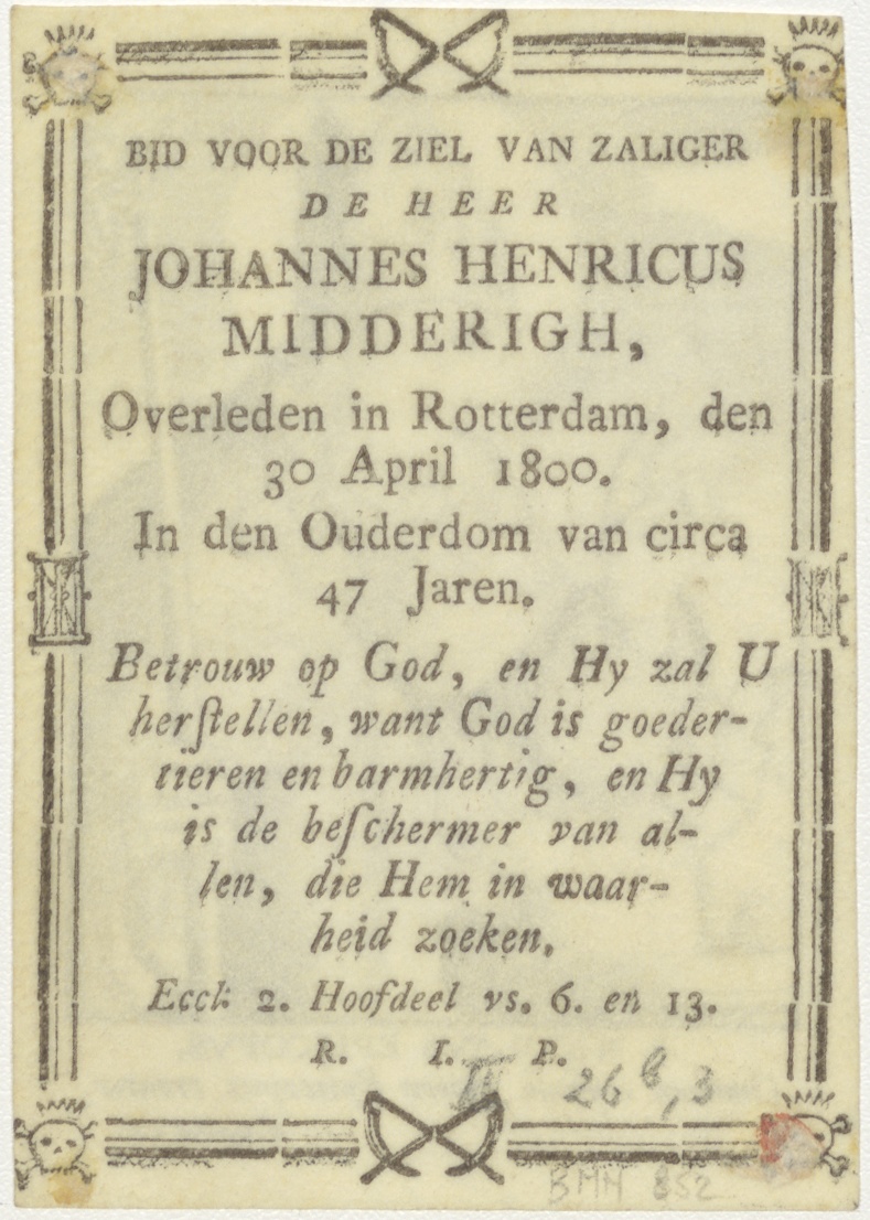 H. Nicolaas, S. Nicolaus, episcopus, kz. Bid voor ziel Midderigh (+1800);Rotterdam;