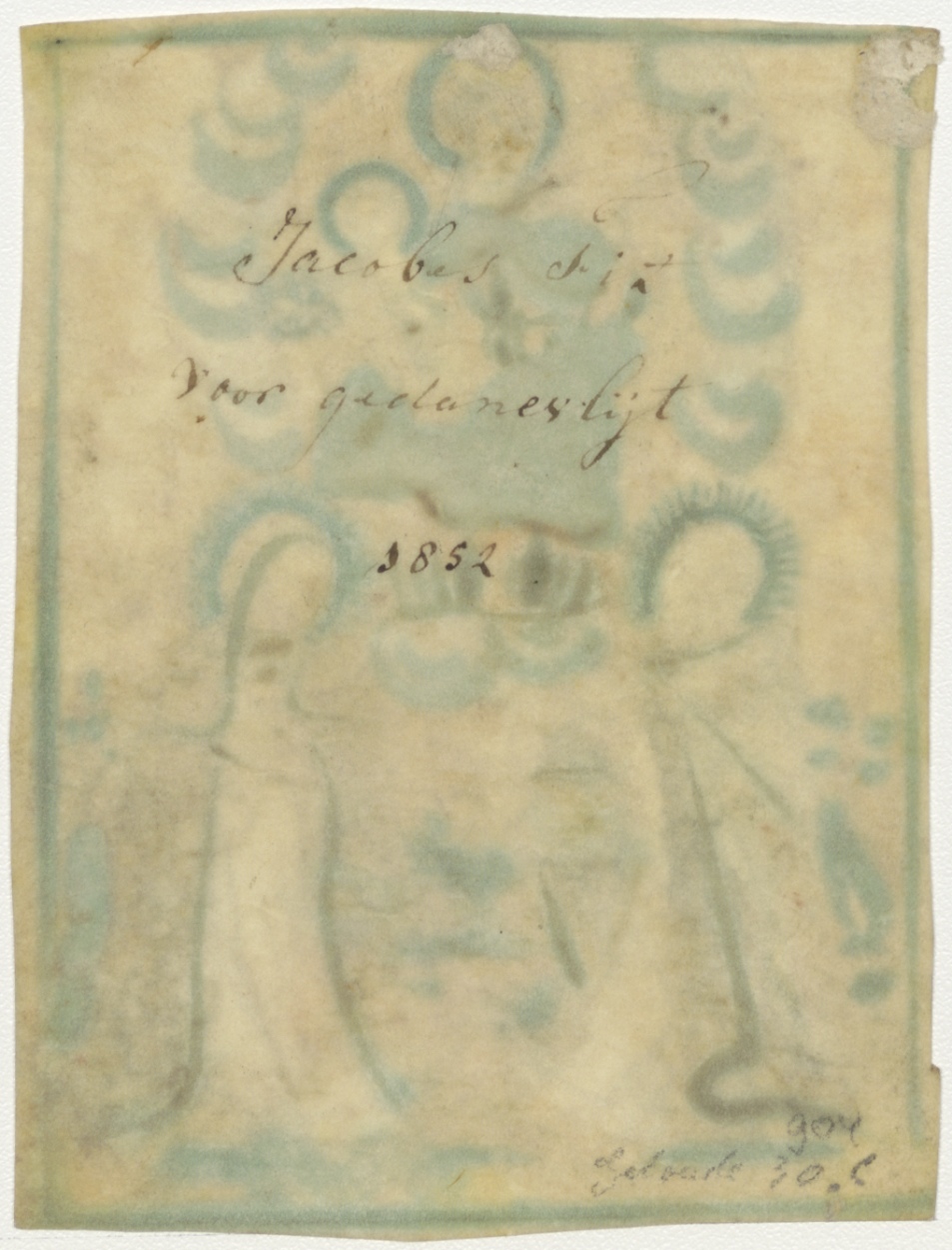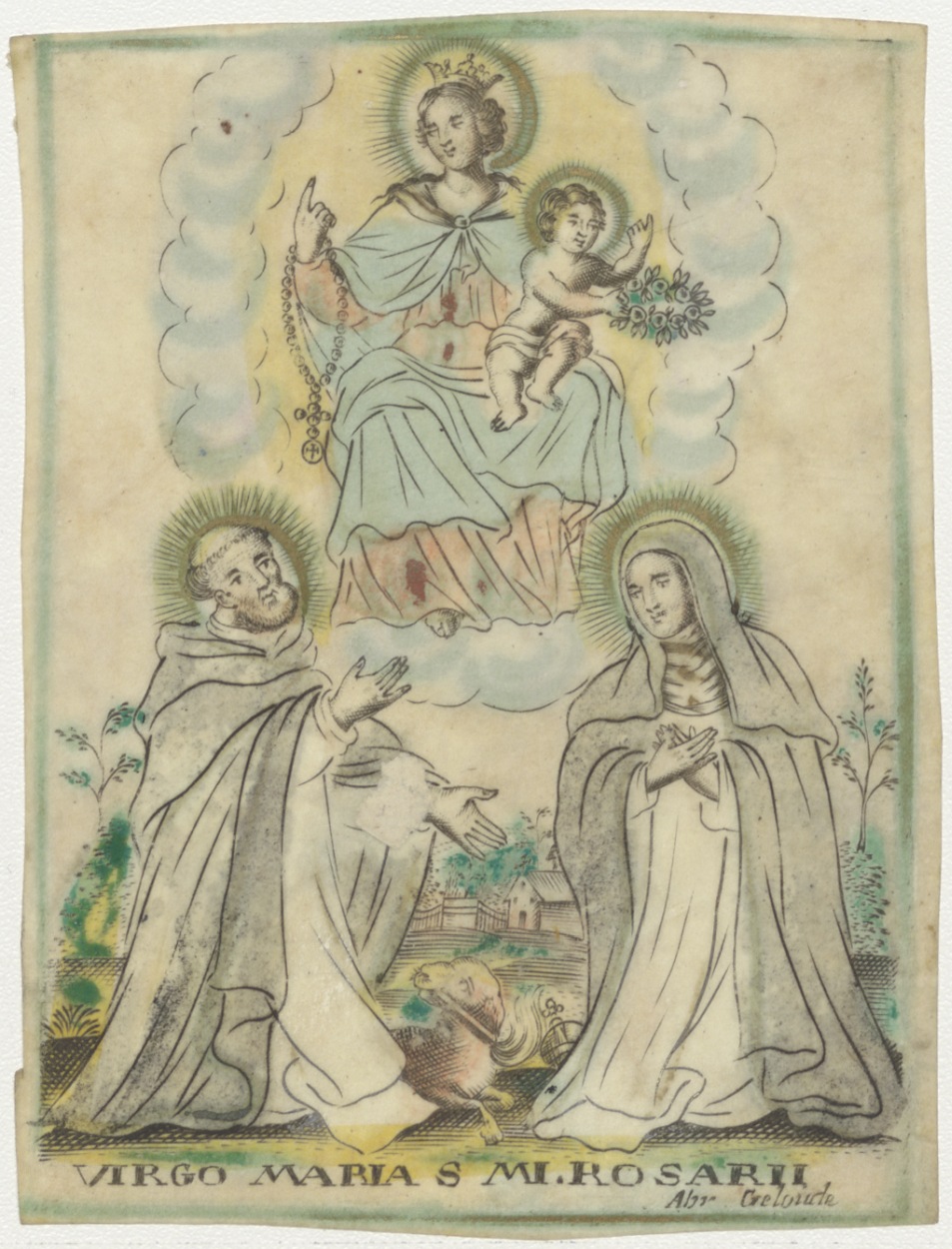 H. Maria van de Rozenkrans (Rosari) met Christuskind en twee heiligen, ingekleurd, kz. Beloning voor gedane vlijt 1852