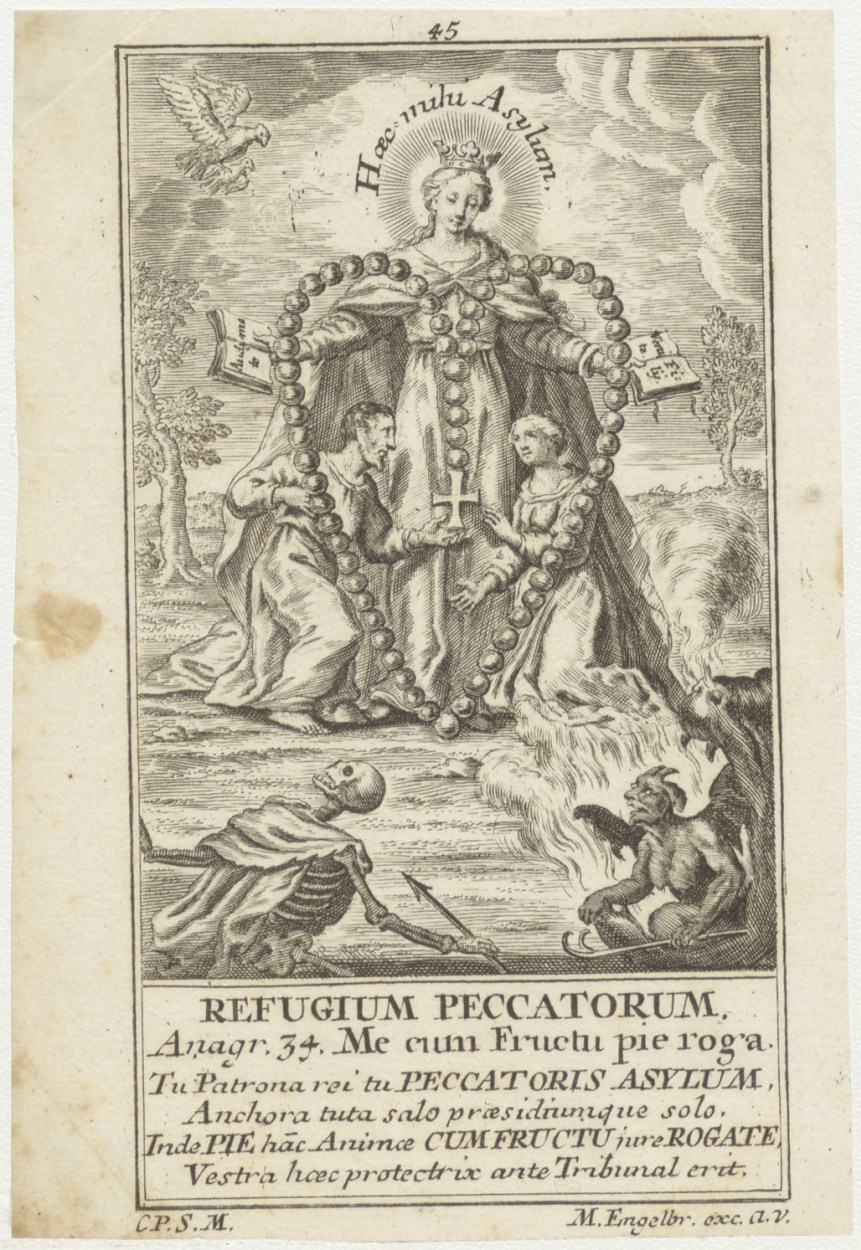 Refugium Peccatorum, Maria met rozenkrans in hartvorm, man en vrouw en duivel