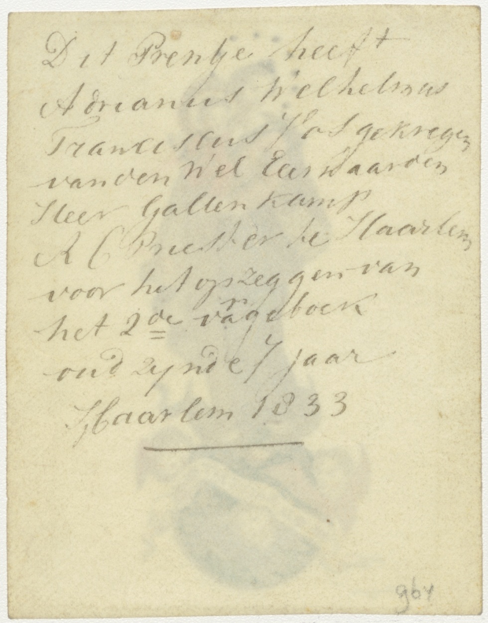 Maria met Christuskind, ingekleurd, kz. Beloning aan Vos van pastoor Gallenkamp, priester te Haarlem;1833;