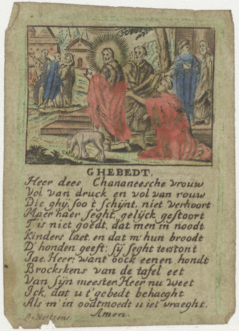Christus en de Kananeese vrouw, ingekleurd, met "Ghebedt, Heer dees Chananeesche vrouw vol van druck en vol van rouw ..."kz. Klaas ... Ter gedachtenis van Trijntje Schoone..."
