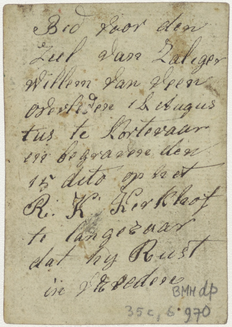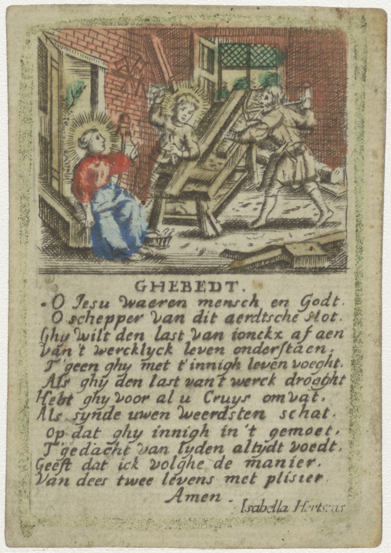 H. Familie in timmermanswerkplaats, ingekleurd, met "Ghebedt O Jesu waeren mensch en Godt. O Schepper van dit aerdtse slot...", kz. Bid voor ziel Willem van Veen, overleden te Korteraar, begraven te Langeraar