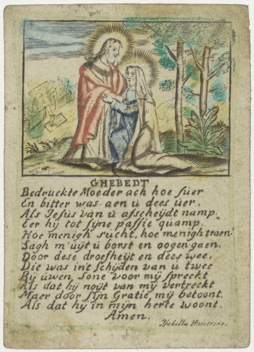 Christus neemt afscheid van Maria, ingekleurd, met "Ghebedt Bedruckte Moeder ach hoe suer En bitter was aen u dees uer ..."