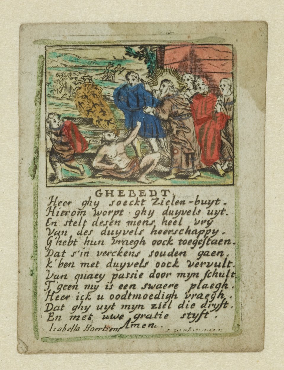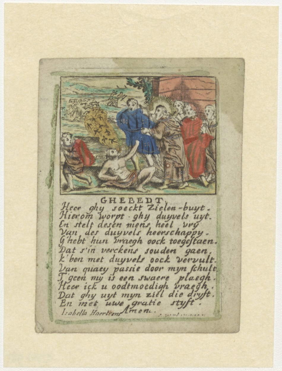 Christus als drijft duivels uit bij man, ingekleurd, met "Ghebedt Heer ghij soeckt zielen-buyt. Hierom worpt ghij duijvels uijt. ..."