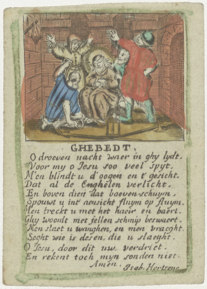 Marteling van Christus, passiescène, ingekleurd, met "Ghebedt O droeven nacht waer in ghij lijdt, Voor mij o Jesu soo veel spijt. ..."