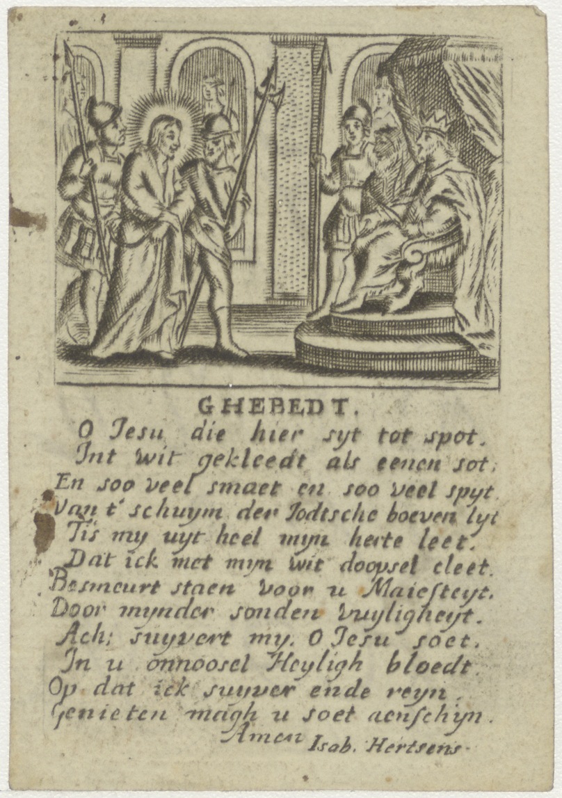 Christus voor Pilatus, met "Ghebedt, O Jesu die hier sijt tot spot. Int wit gekleedt als eenen sot. ..."kz. alfabet