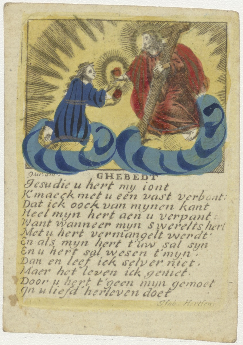 Christus geeft zijn hart aan de mensen, ingekleurd, met "Ghebedt, Jesu die u hert mij iont. k' maeck met u een vast verbont. ..."