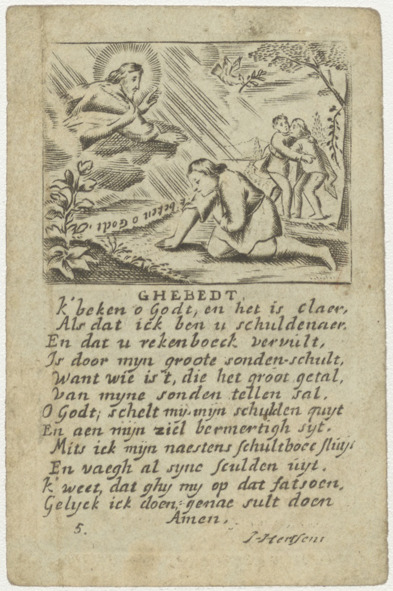 Schuldbelijdenis van een mens tot God, met "Ghebedt, K' beken o Godt, en het is claer, Als dat ick ben u schuldenaer ..."