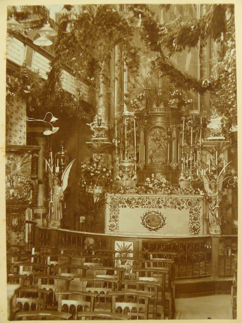 Interieur van de Begijnhofkapel (HH. Johannes en Ursulakerk) te Amsterdam, met versierd altaar
