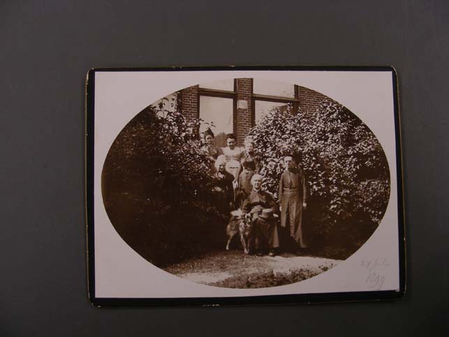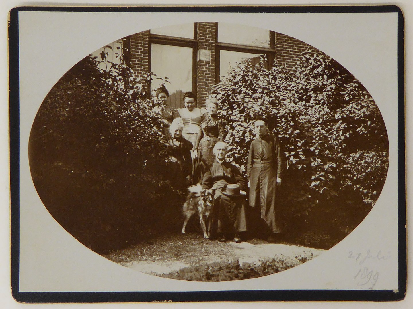 Groepsportret met Mgr. Jacobus Joannes Graaf en een hondje in een tuin op 27 juli 1899, ovaal