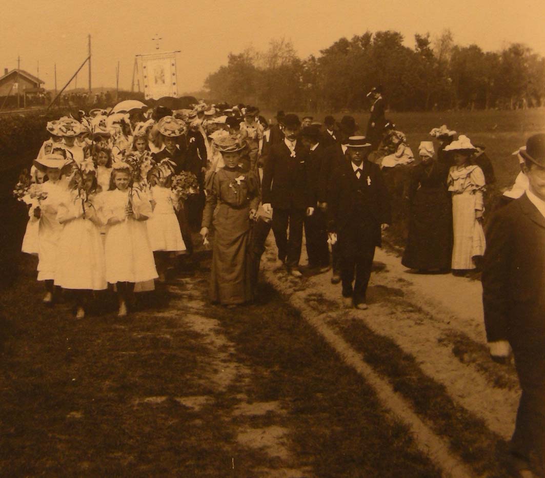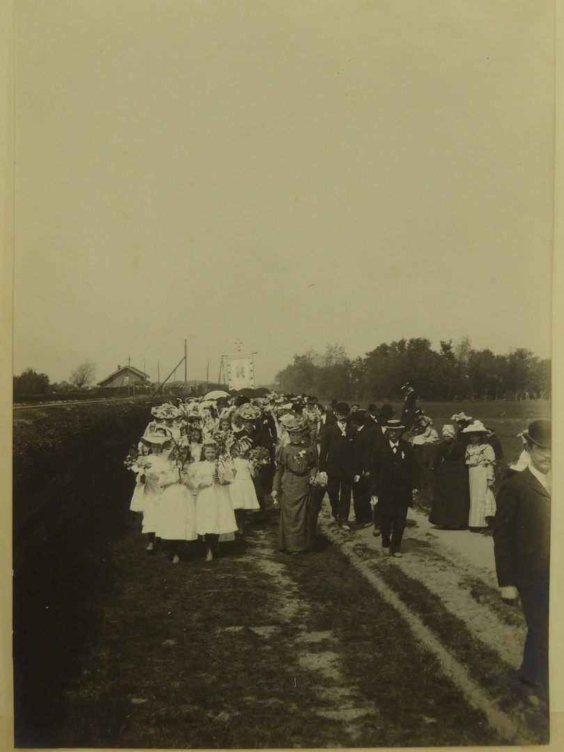 Processie met vaandel Beverwijk en Omstreken op weg naar steenlegging kapel Heiloo door Jacobus Joannes Graaf