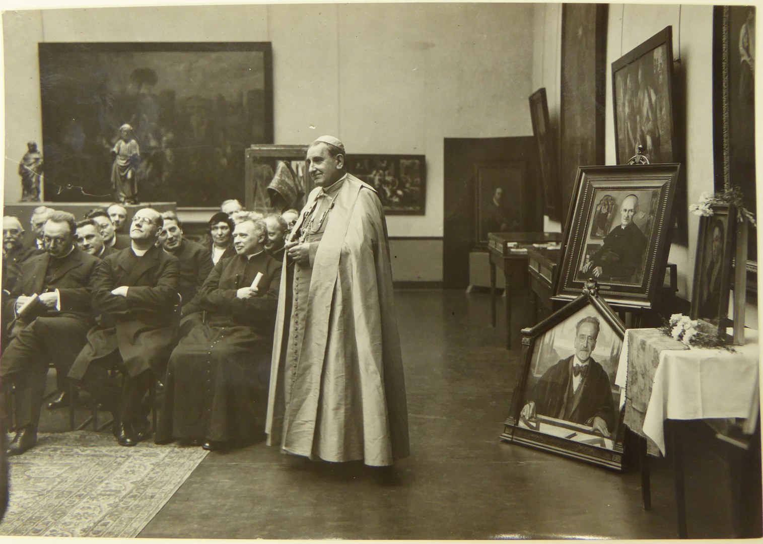 Heropening BMH na de nieuwbouw door Stuyt met Mgr. Joannes Aengenent en priesters, met portretten van Graaf en Stuyt