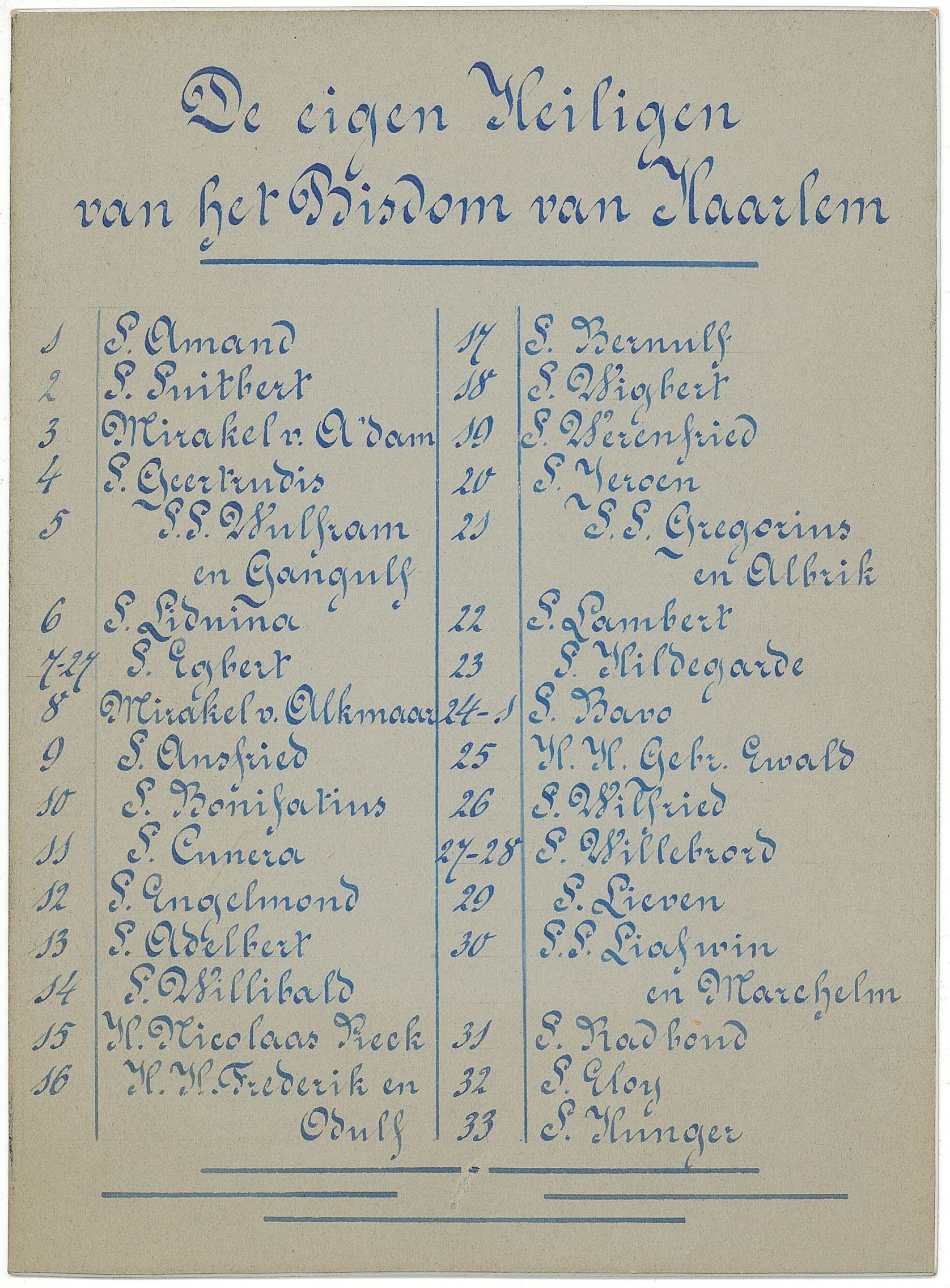 Indexkaart van 33 foto's van tekeningen getiteld "De eigen Heiligen van het Bisdom van Haarlem"