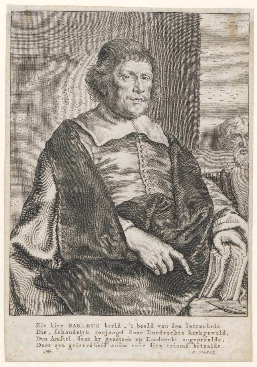 Ter halver lijve, rechts, met boek in de linkerhand. Vierregelig gedicht door J. Nomsz. 'Zie hier Barlaeus beeld, 't beeld van de letterheld...', gedateerd 1786.