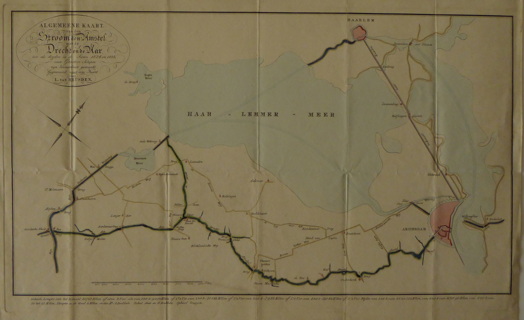 Kaart van de stroom de Amstel met de Drecht en de Aar, ingekleurd