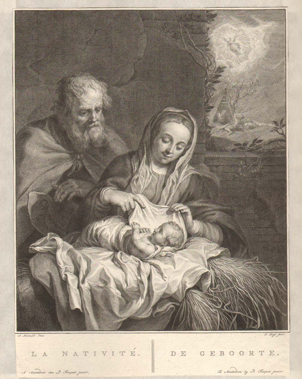 Heilige Familie: Centraal het Christuskind dat halfnaakt en half in doeken gewikkeld op een doek op hooi/stro ligt. Achter Hem Maria die een deel van de doek waarin Christus is gewikkeld omhoog houdt met beide handen. Zij draagt een hoofddoek en kijkt glimlachend naar haar Kind. Links van Maria Jozef met de linkerhand op zijn ...