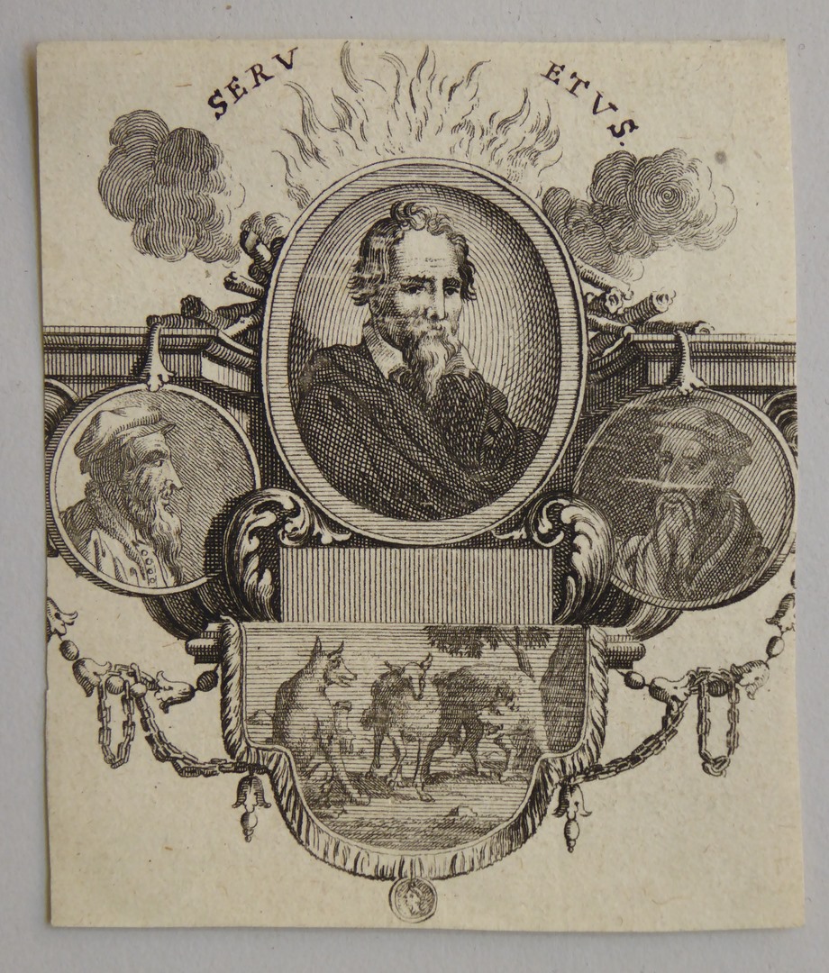 Portret van Servet in een medaillon, links en rechts kleine portretjes van Calvijn
