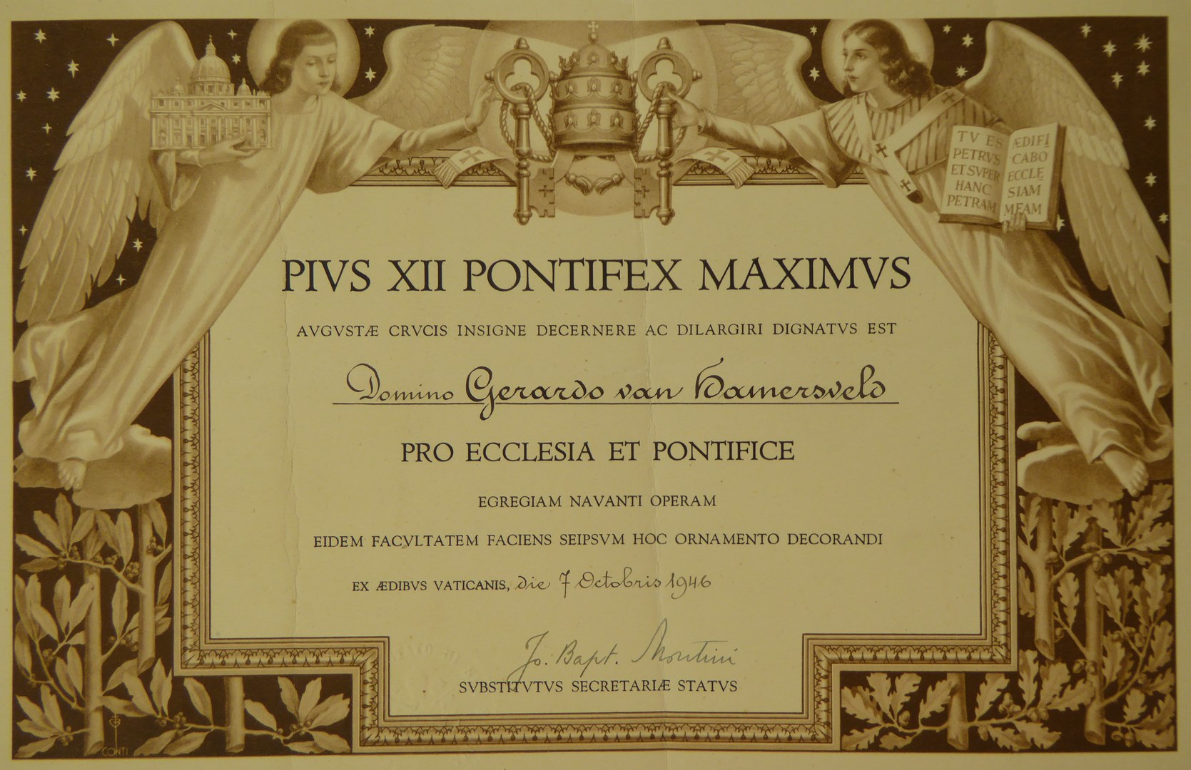 Acte van toekenning door paus Pius XII aan Gerard van Hamersveld het insigne van het verheven kruis
