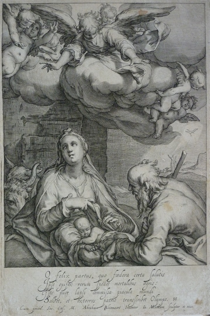De Heilige Familie met engelen: Levendige prent. Centraal op de voorgrond Maria met het slapende naakte Christuskind op schoot. Zij houdt met beide handen de doek vast die hem bedekte. Haar gezicht en ogen zijn naar boven gericht. Aan haar linkerkant de os en de nauwelijks zichtbare ezel. Aan de rechterkant van Maria knielt Jozef. ...