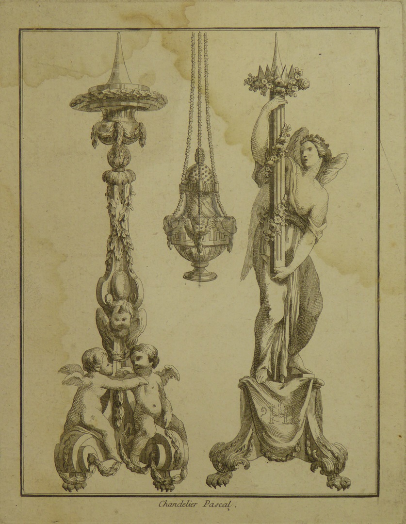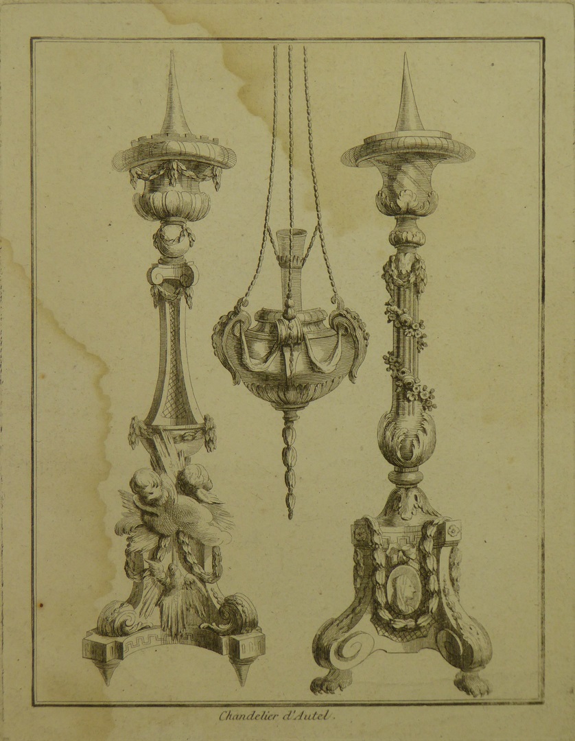 Ornamentprenten (serie): ontwerpen voor altaarkandelaars en wierookvaten (2 exemplaren)
