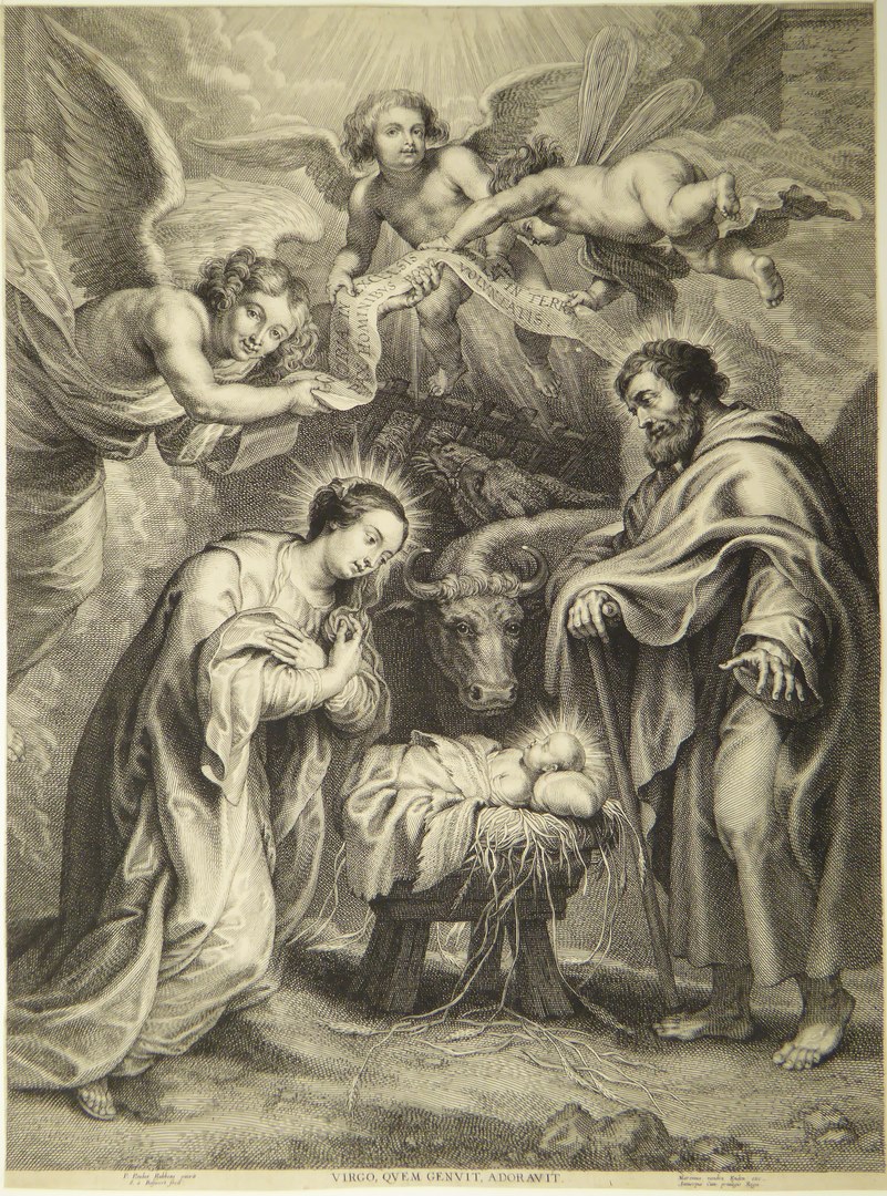 Geboorte van Christus, Maria knielt voor het kind in de kribbe