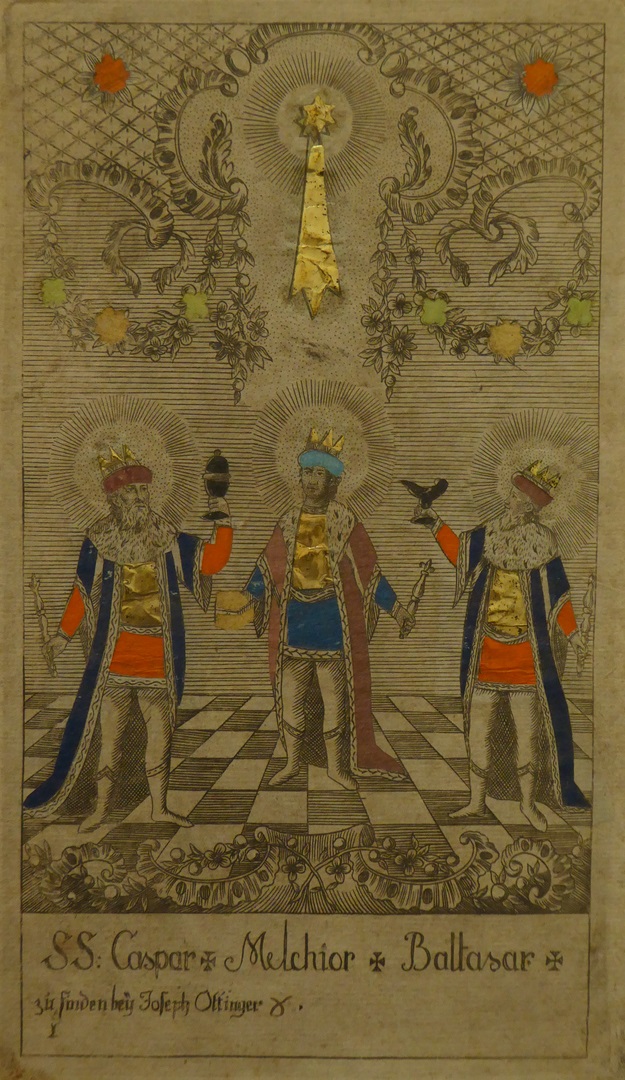 Drie koningen, Caspar, Melchior en Balthasar met hun geschenken, opgelegd met bladgoud(?)