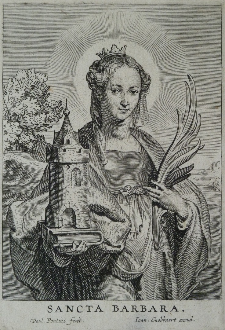 H. Barbara met toren, als halffiguur in een landschap weergegeven