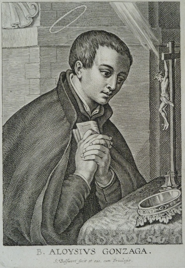 Aloysius van Gonzaga, wendt zich met gevouwen handen naar een crucifix