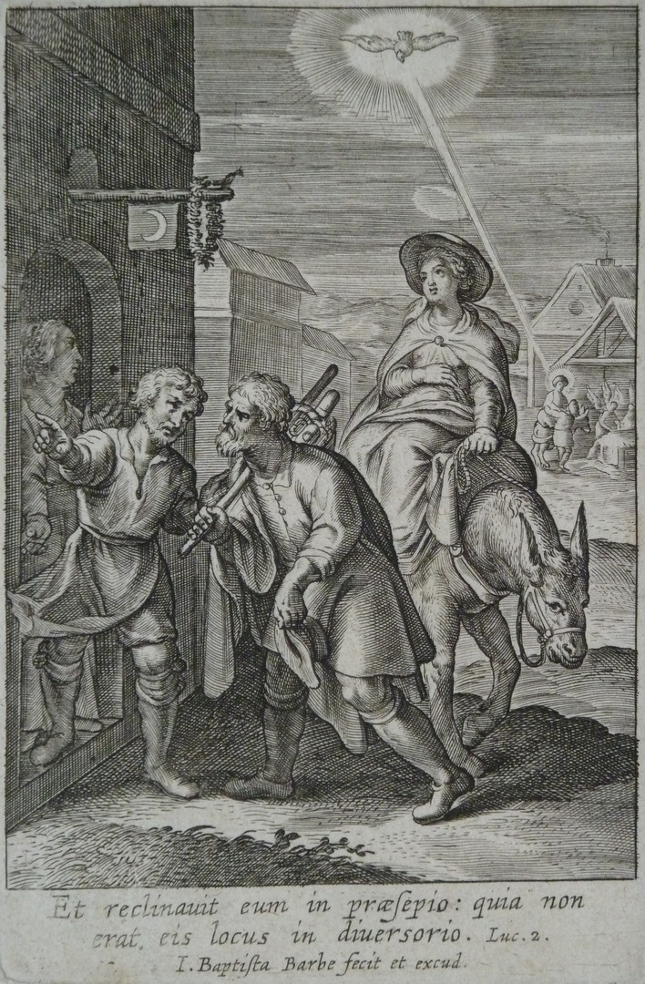 Jozef en Maria zoeken onderdak in Bethlehem: prent met tweeledige voorstelling: Op de voorgrond zoeken Jozef en Maria onderdak. Op de achtergrond een voorstelling van de stal waarbij Jozef Maria van de ezel tilt en engelen een bed/kribbe spreiden. Op de voorgrond rechts van het centrum staat Jozef in loophouding met zijn linkerbeen naar achteren.Met ...