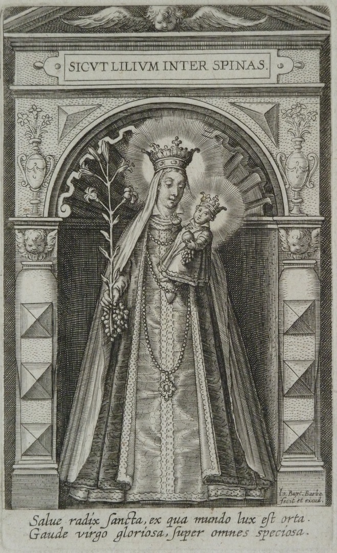 Mariabeeld met kind, met "Sicut lilium inter spinas"