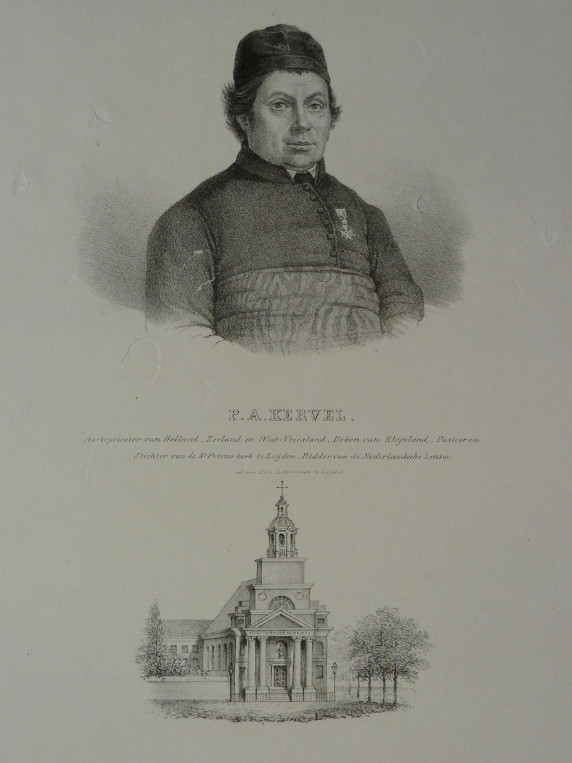 Portret van Petrus Antonius Kervel (1782-1846), pastoor Pieterskerk Leiden, aartspriester Holland, met Sint Petruskerk te Leiden