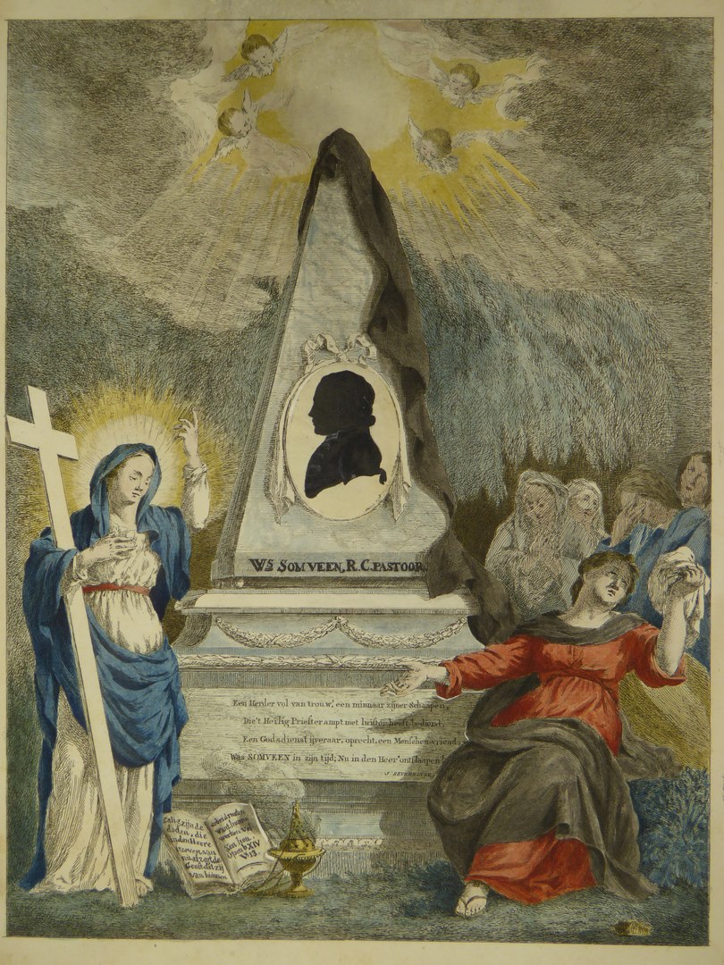 Prent van grafmonument van Wilhelmus Somveen (1751-1802), R.K. pastoor te Haarlem, waarop geplakt een getekend silhouetportret, ingekleurd
