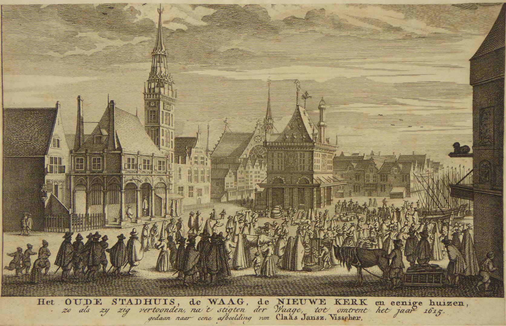 Amsterdam, oude stadhuis, de Waag en Nieuwe Kerk zoals ze zig vertoonden, na 't stigten der Waage, tot omtrent het jaar 1615