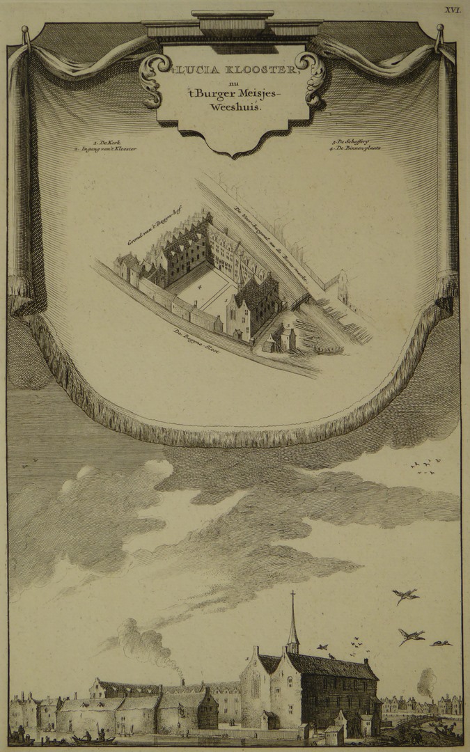 Amsterdam, afbeelding van St. Lucia-klooster anno 1544, Burger-meisjes weeshuis