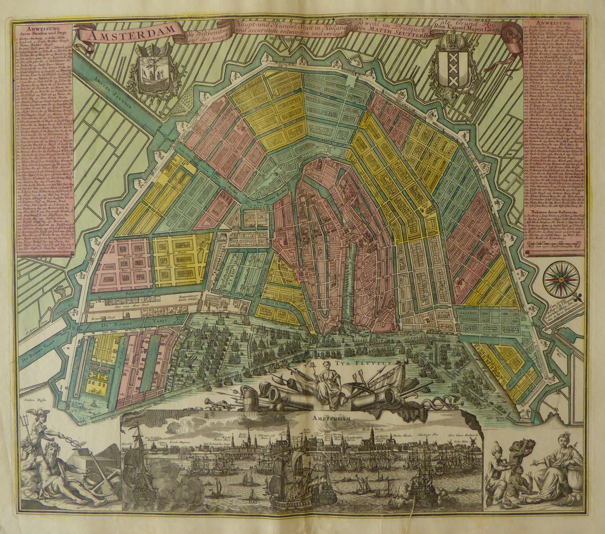 Kaart van Amsterdam "... weltberuhmte Haupt und Handel statt in Holland...", ingekleurd