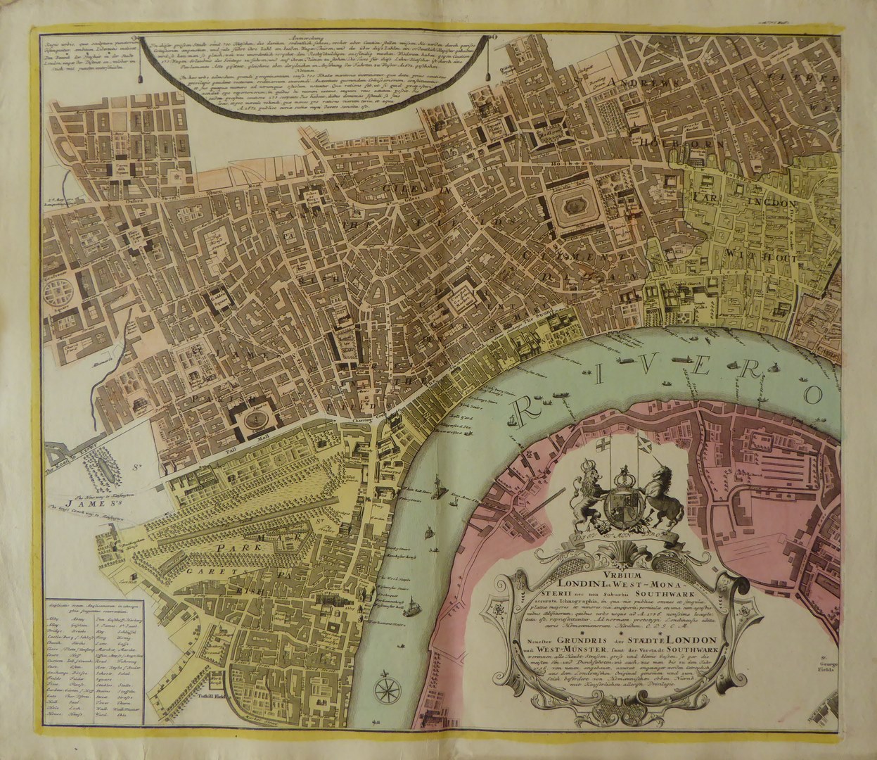 Kaart van Londen "Neuester Grundis der Staedte London und West-Munster...", ingekleurd