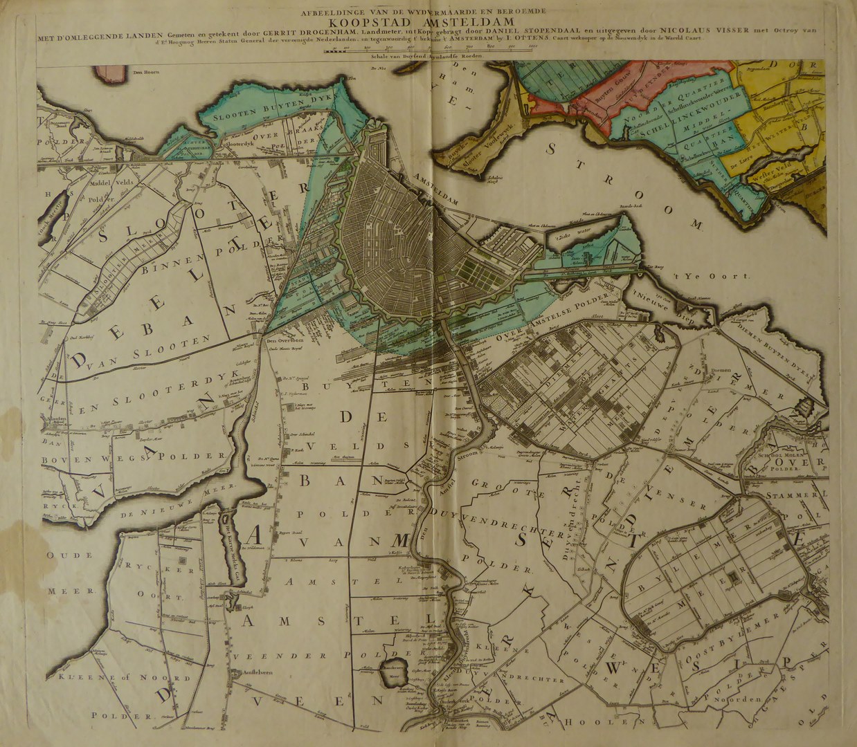Kaart van Amsterdam " ... wijdvermaarde en beroemde koopstad Amsterdam...", ingekleurd