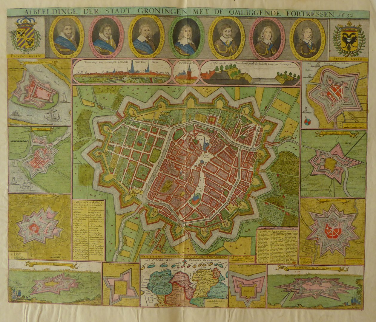 Kaart Groningen en omliggende Forten "Afbeeldinge der stadt Groningen ... 1652", ingekleurd