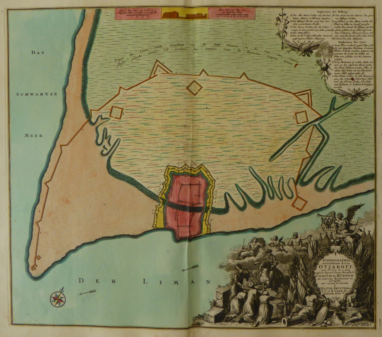 Kaart van Ochakov (ten N.O. van Odessa) "Iconographia munitissimae Arcis Otzakoff...", ingekleurd